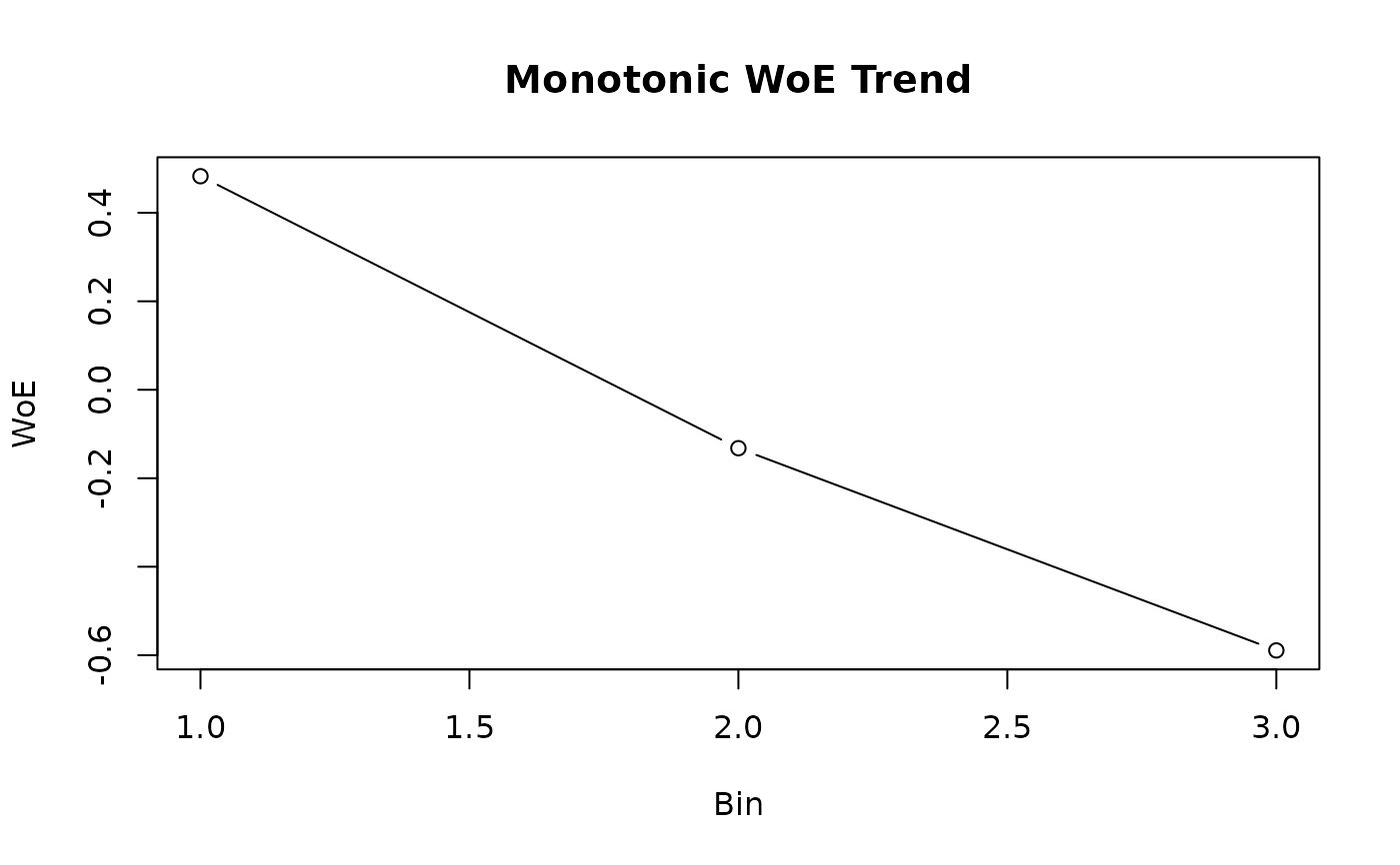 determined via Pearson correlation between bin indices and WoE values. Bins