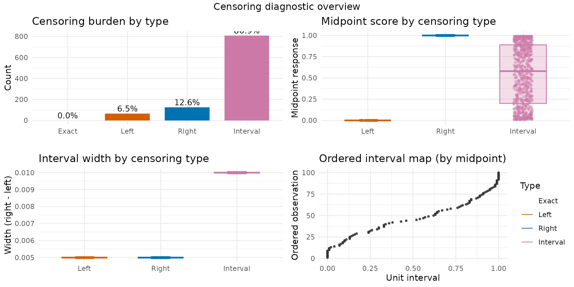 The complete likelihood supports four censoring types, automatically