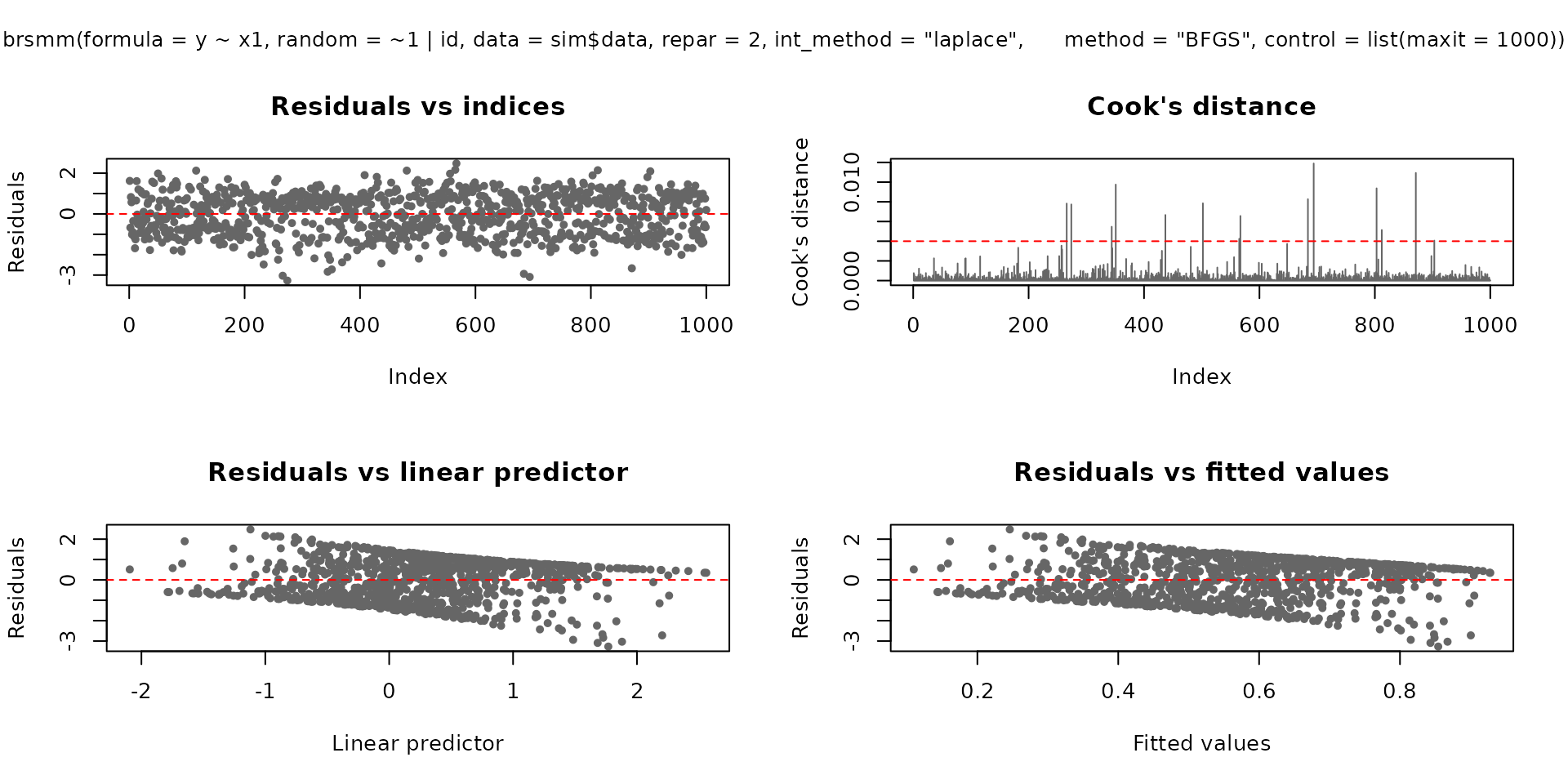 #> brsmm(formula = y ~ x1, random = ~1 | id, data = sim$data, repar = 2,