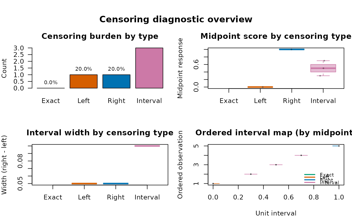 Invisibly returns a data frame with censoring counts and proportions, percentages, and interpretation flags.