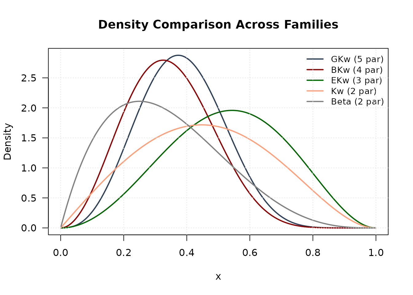 - Seven nested distributions: GKw, BKw, KKw, EKw, Mc, Kw, and Beta