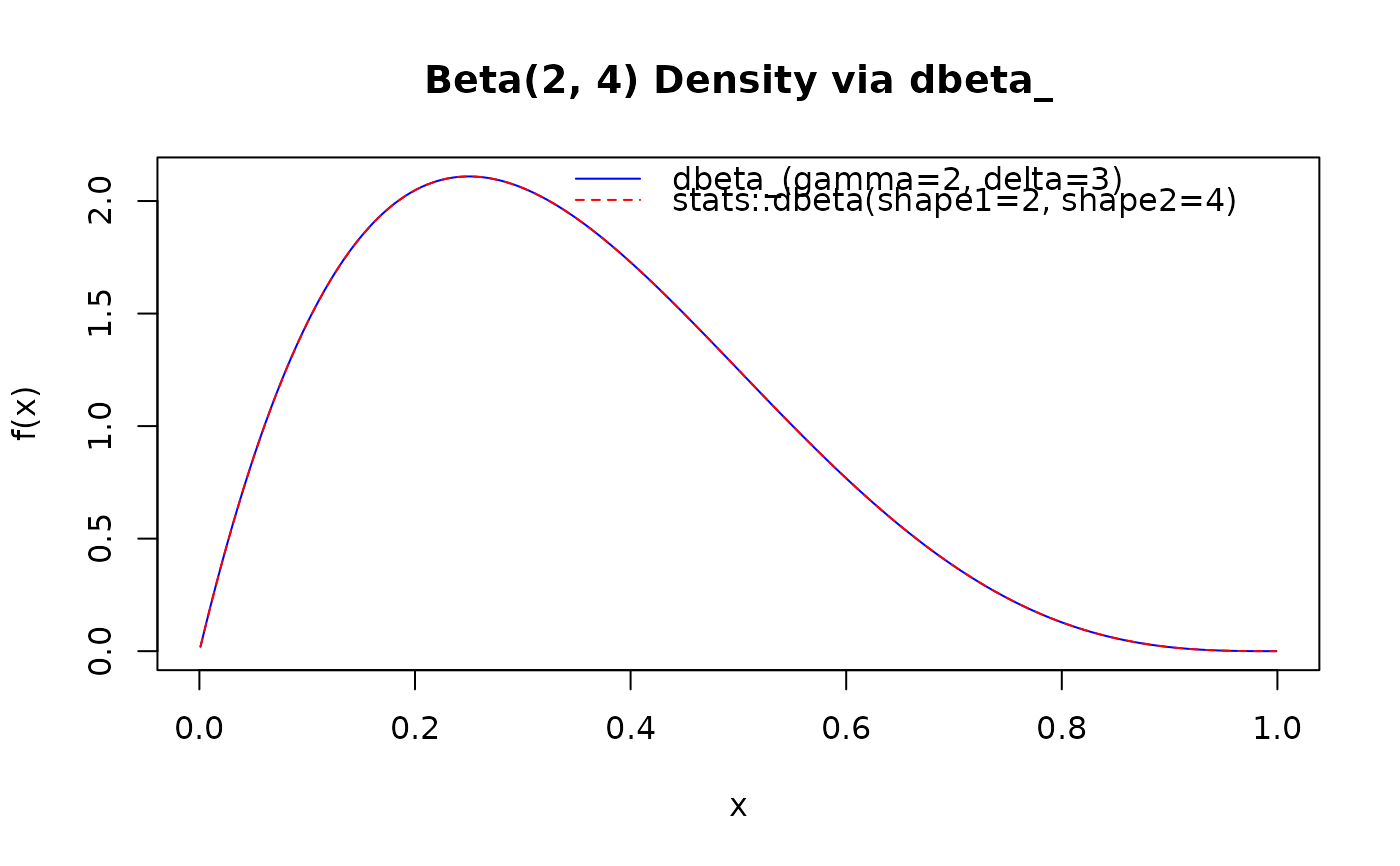 legend("topright", legend=c("dbeta_(gamma=2, delta=3)", "stats::dbeta(shape1=2, shape2=4)"),
