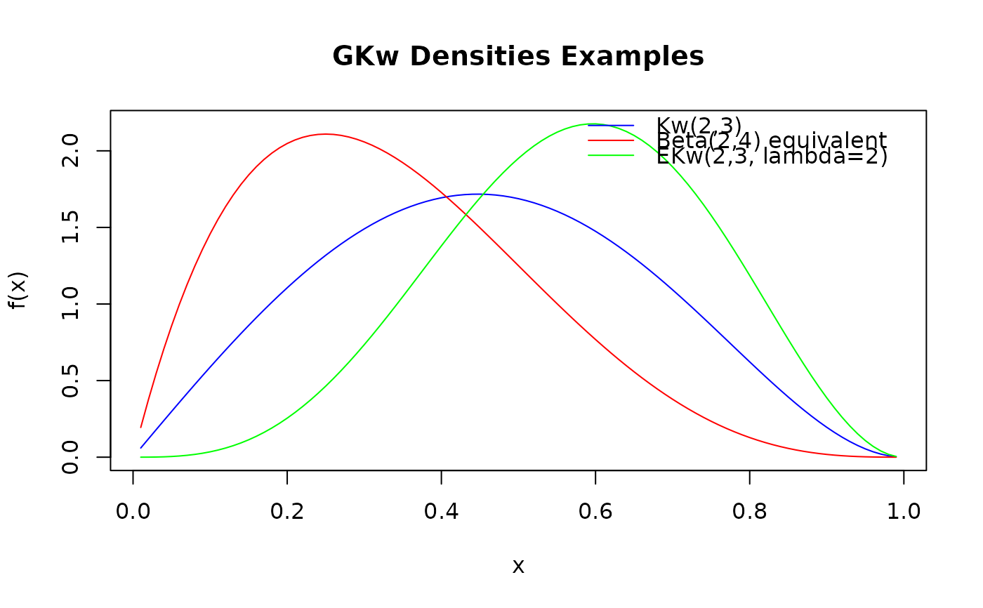 legend("topright", legend = c("Kw(2,3)", "Beta(2,4) equivalent", "EKw(2,3, lambda=2)"),