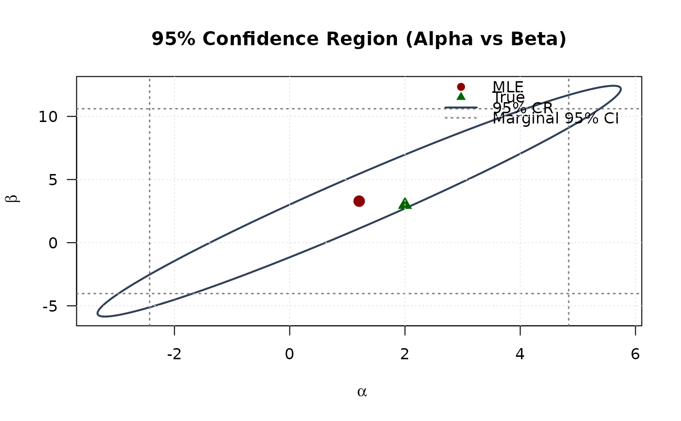 main = "95% Confidence Region (Alpha vs Beta)", las = 1)
