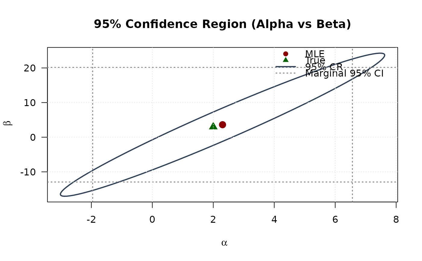 main = "95% Confidence Region (Alpha vs Beta)", las = 1)