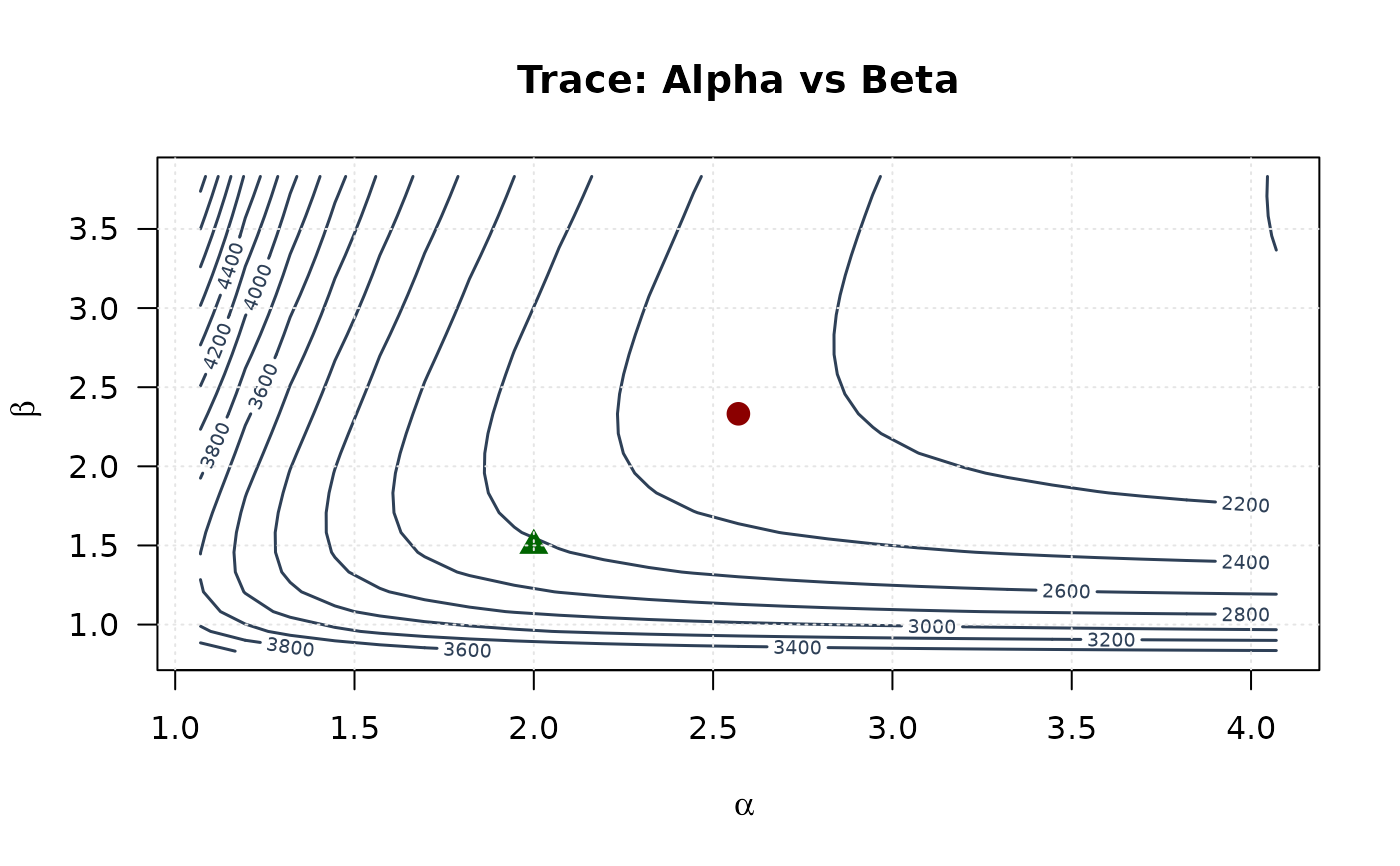 points(mle[2], mle[4], pch = 19, col = "#8B0000", cex = 1.5)