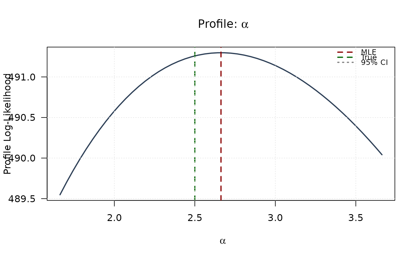 xlab = expression(alpha), ylab = "Profile Log-Likelihood",