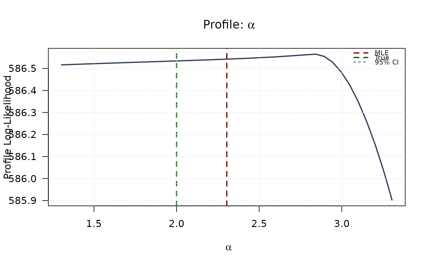 xlab = expression(alpha), ylab = "Profile Log-Likelihood",