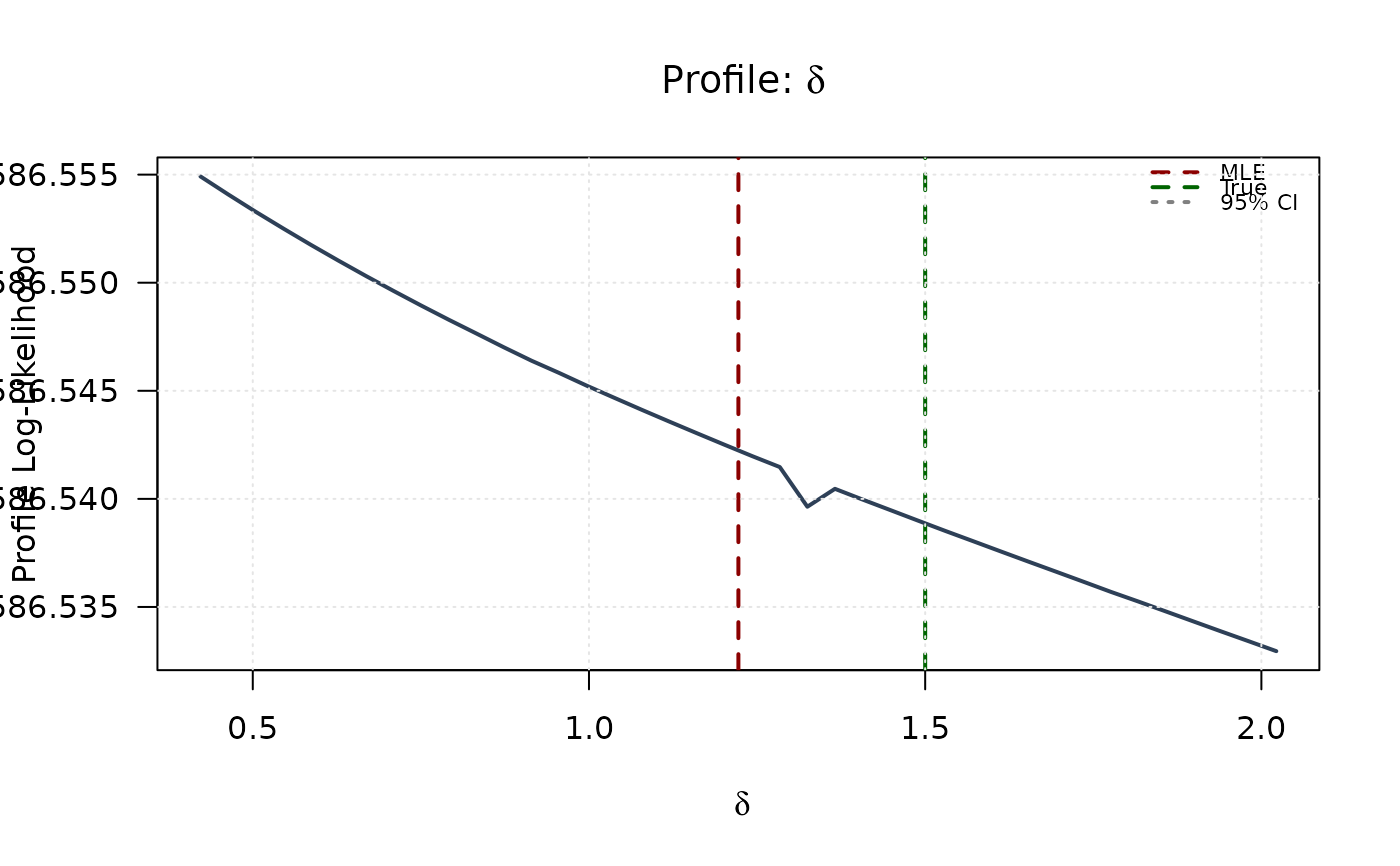 xlab = expression(delta), ylab = "Profile Log-Likelihood",