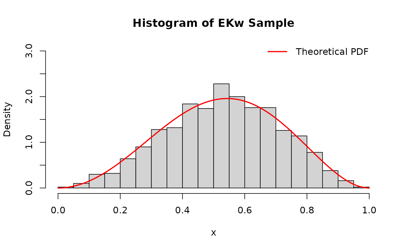 main = "Histogram of EKw Sample", xlab = "x", ylim = c(0, 3.0))
