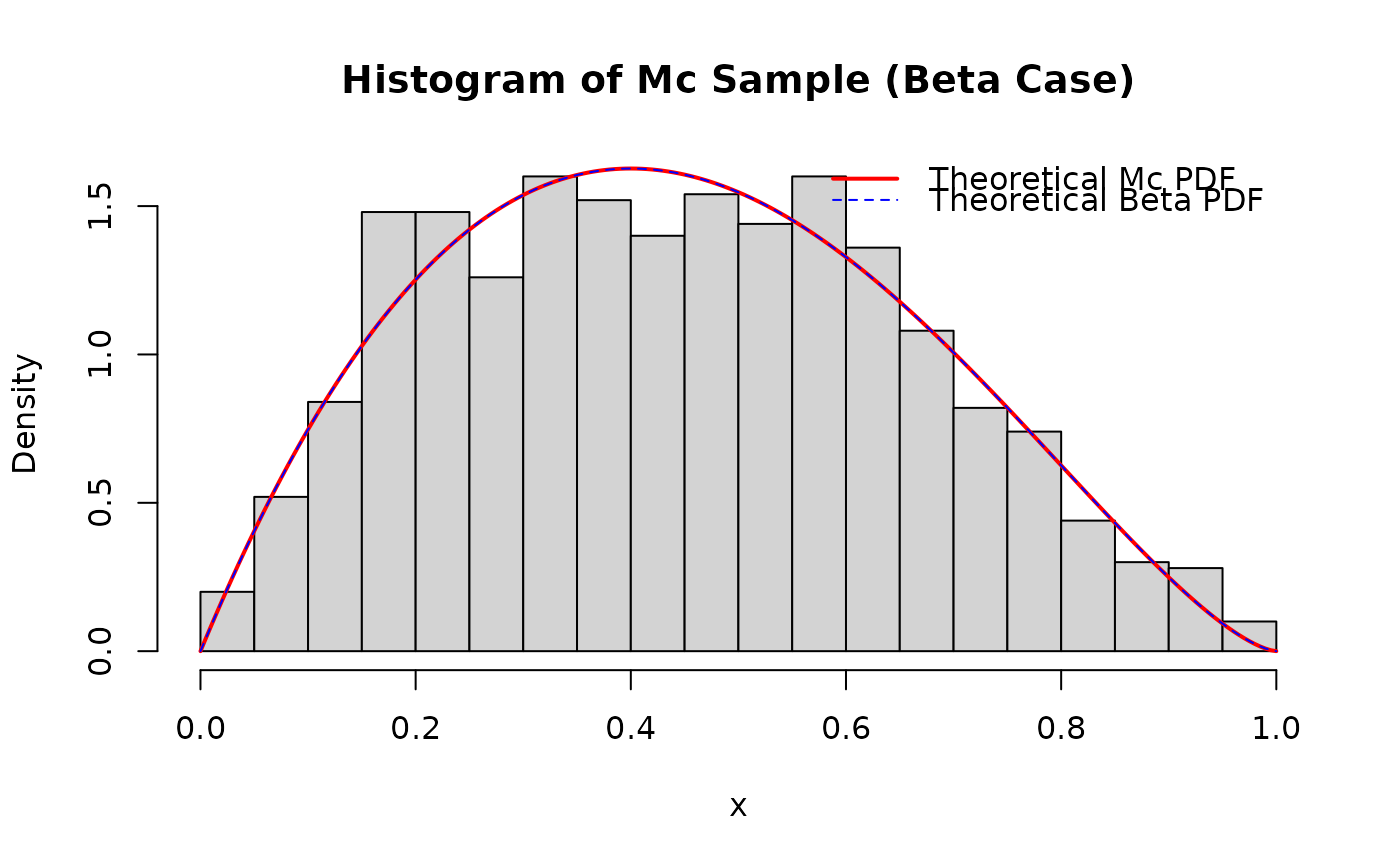 legend("topright", legend = c("Theoretical Mc PDF", "Theoretical Beta PDF"),