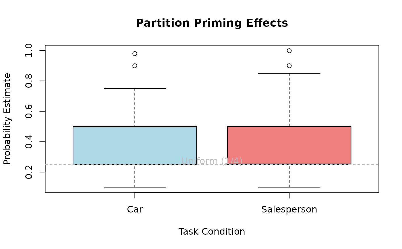 The key manipulation is the implicit partition: In the Car condition, there are multiple car types (binary: coupe vs. not coupe), while in the Salesperson condition, there are four specific salespersons. Classical findings suggest that different partition structures lead to different probability estimates even when the actual probabilities are equivalent.