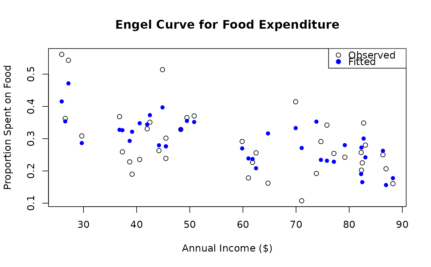 xlab = "Annual Income ($)", ylab = "Proportion Spent on Food",
